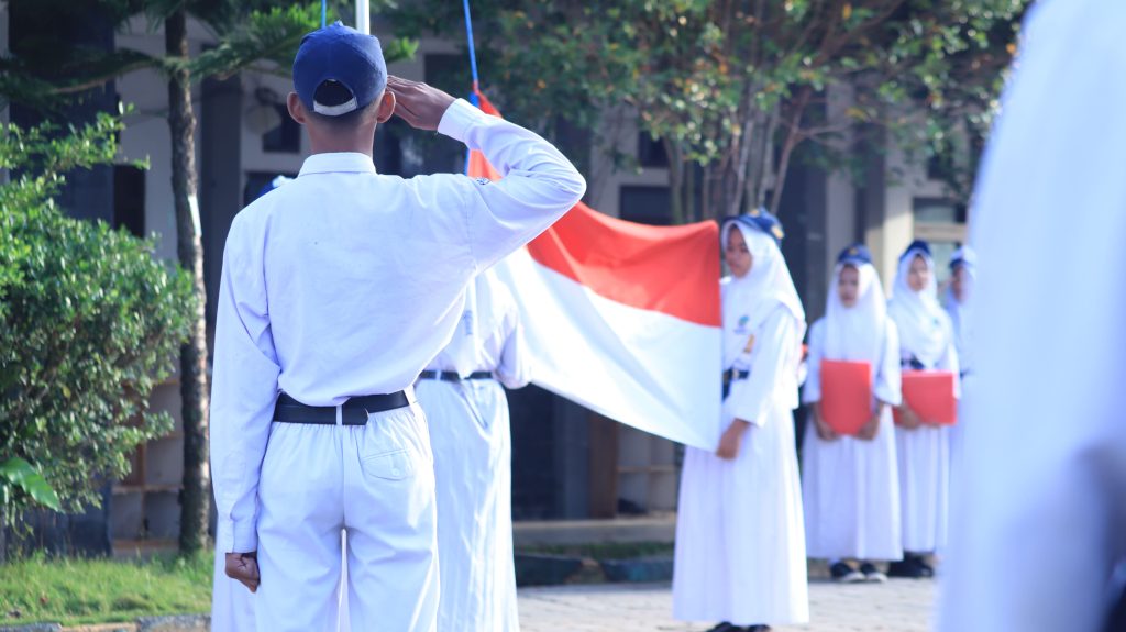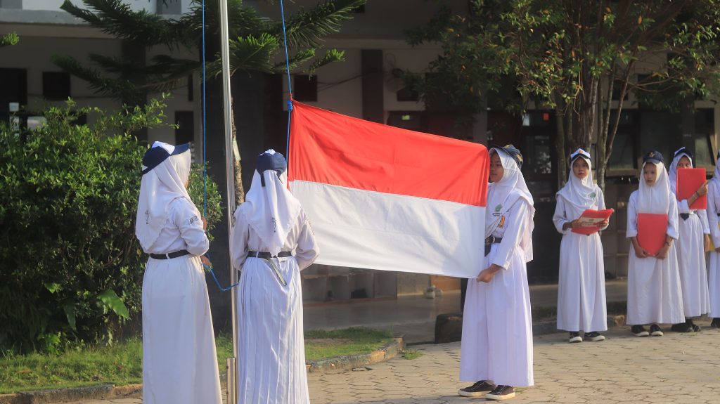 Momen pengibaran bendera Merah Putih dilaksanakan secara presisi oleh trio pembawa bendera: Citra, Dewi, dan Syifa. Prosesi upacara dipandu oleh Aini selaku MC, diikuti pembacaan UUD 1945 oleh Kalifa, pengucapan Janji Siswa oleh Azizah, serta pembacaan doa yang menyentuh oleh Nabila. Kelancaran administrasi upacara juga didukung oleh Fatur sebagai ajudan pembina dan Rapika yang memandu lagu kebangsaan sebagai dirijen.